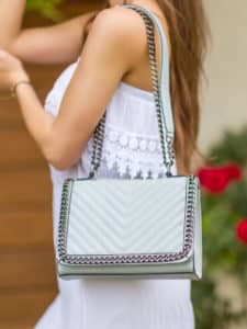 Trendy kabelky s řetězovými akcenty. Řetězový trend nebyl vidět jen u kabelek. Prolíná se celou podzimní módou od šperků, přes oblečení až po boty. Řetěz nemusí být jen zlatý nebo stříbrný. Bílý řetěz vypadá na kabelce velmi dobře.